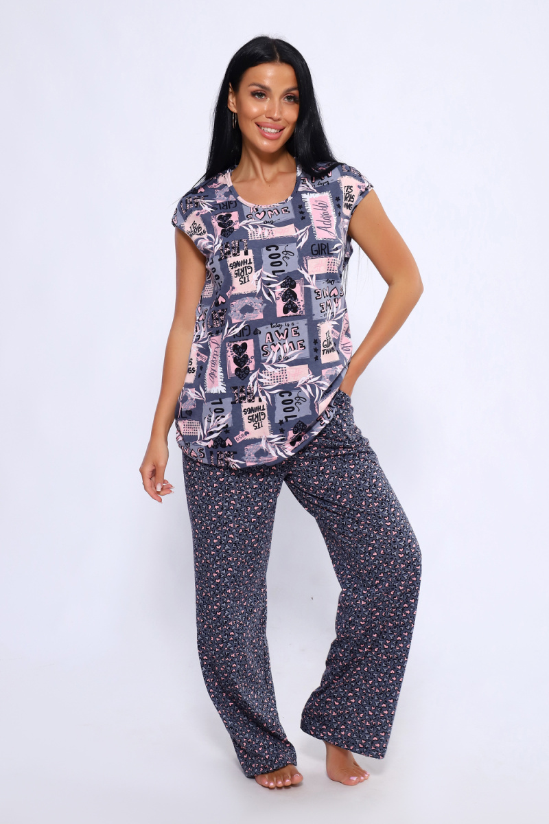 Женский костюм из 100% хлопка, длинные широкие брюки на эластичной резинке по талии шириной 3 см., с карманами в боковых швах и футболкой со спущенным плечом. Брюки в двух расцветках. Интересное и актуальное цветовое сочетание серых и розовых оттенков отличный вариант. Брюки и футболку можно сочетать и с другими предметами вашего гардероба. Ткань не просвечивает и имеет эластичность, обеспечит комфортное времяпрепровождение вашего досуга как дома так и на отдыхе. На фото модель представлена в 48 размере.